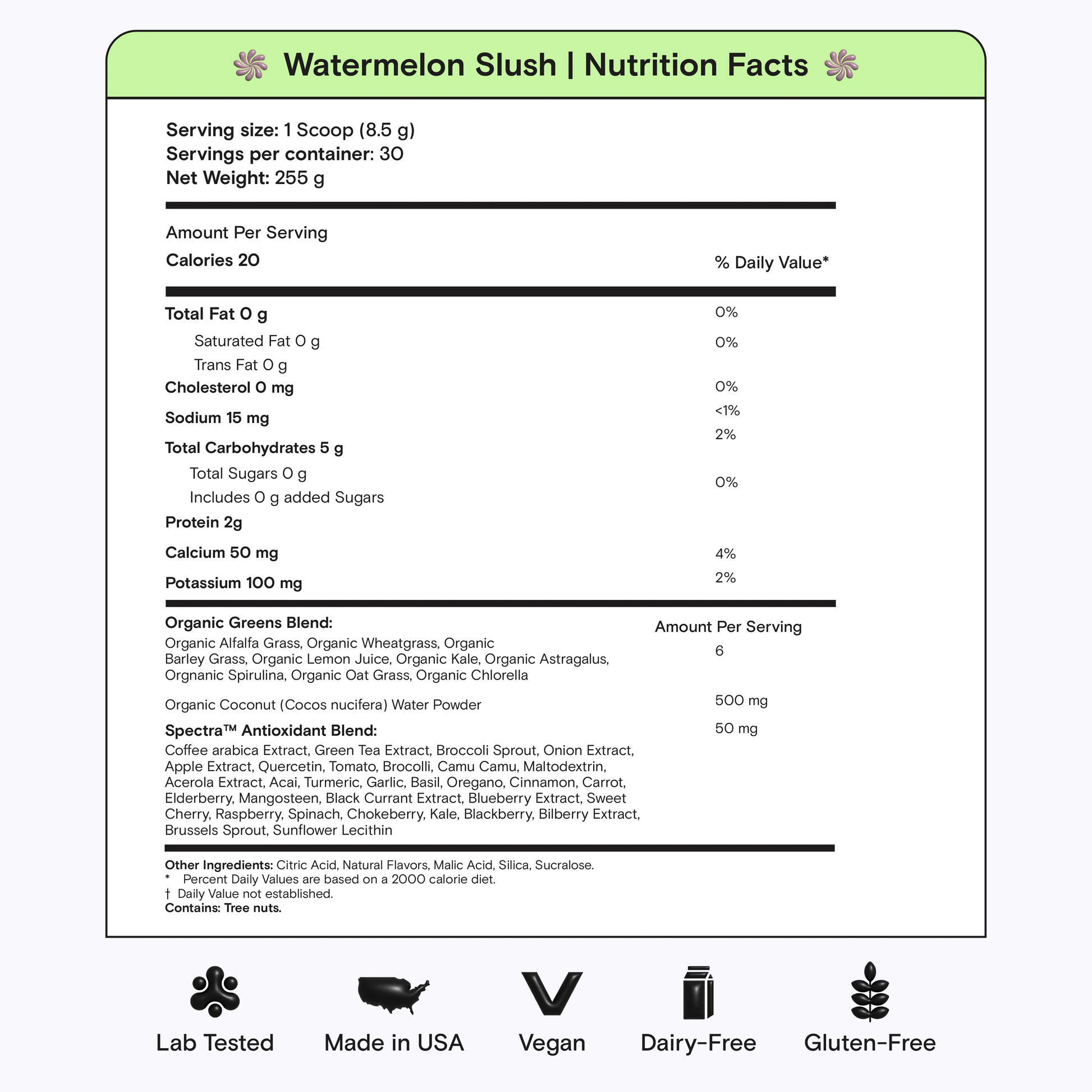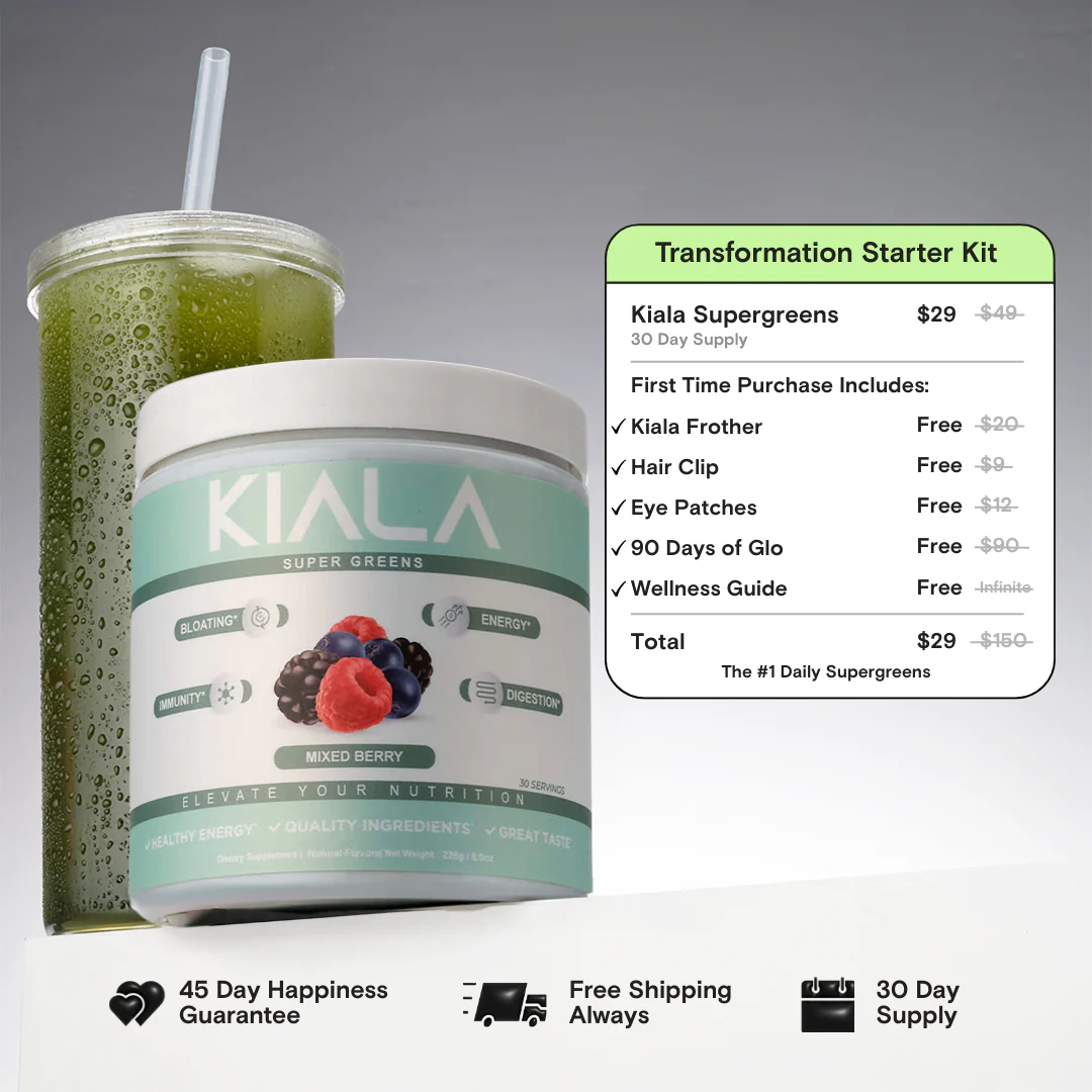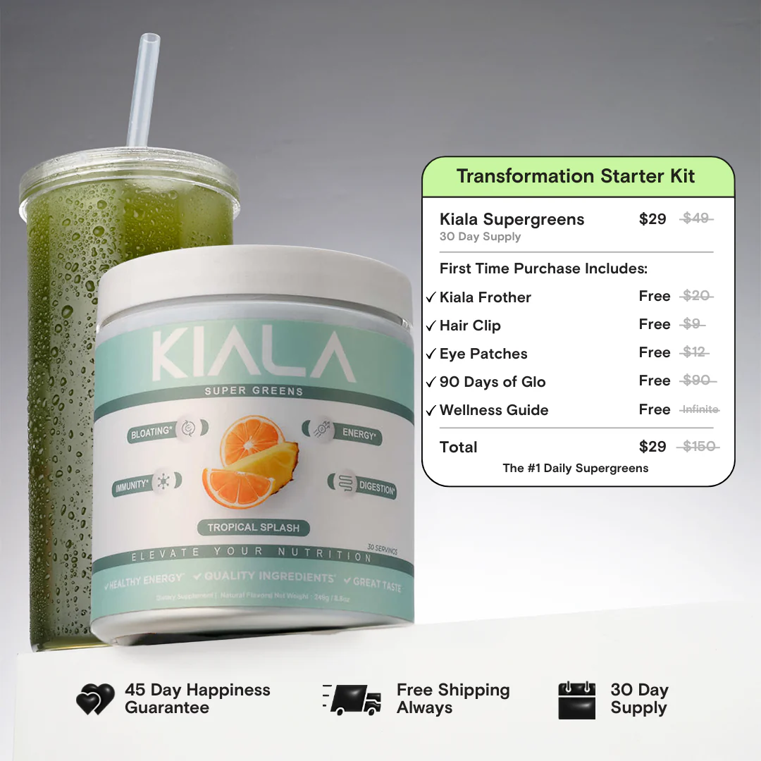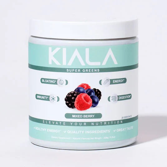 Kiala is a comprehensive superfood blend featuring six powerhouse organic ingredients—spirulina, chlorella, kale, wheatgrass, acai, and coconut water powder—anchored by Spectra®, the first scientifically validated antioxidant blend of 30+ fruits, vegetables, and herbs proven in human clinical trials to inhibit free radical production and optimize cellular function